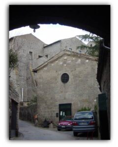 Continuando la salita, si costeggiando sulla destra l’ex convento dei frati Antoniani di Vienne (42), che all’inizio del ’400 gestivano l’annesso ospedale per i malati di ergotismo ovvero il «fuoco di sant’Antonio». Sul finire degli anni ’90 dello scorso secolo, all’interno dell’edificio (oggi non accessibile) è stato scoperto un interessante affresco del 1426 raffigurante la Madonna con il Bambino assisa in trono tra Santi, da taluni attribuita a Francesco d’Antonio Zacchi, detto il Balletta.