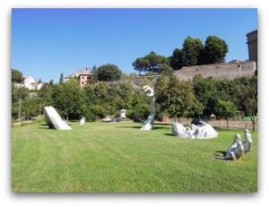 Nel prato antistante S. Croce spicca un’installazione in alluminio composta di cinque pezzi affioranti dal terreno che rappresentano una figura ciclopica nell’atto del risveglio (31).