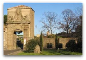 Proseguendo in discesa Via S. Clemente, rasentando l’antico muro del Castrum, si arriva presso uno scenografico segmento murario (38) nel quale si apre Porta di Valle , dalla quale nel Medioevo entrava il diverticolo stradale che proveniva dalla Francigena (coincidente con un tratto della Cassia romana presso l’area termale) e risaliva fino al Colle del Duomo. Uscendo dalla porta, sulla sinistra è il fornice dell’abside della chiesa abbaziale, oggi scomparsa, di S. Maria della Palomba (37).