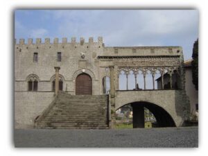 Al termine del ponte, sulla destra, si erge il Palazzo Farnese che nel XV secolo Ranuccio “il Vecchio” fece realizzare sulle fondamenta di una casa appartenuta alla famiglia ghibellina dei Tignosi (24). Probabilmente vi trascorse l’infanzia Alessandro Farnese, più tardi asceso al soglio pontificio col nome di Paolo III (1534-1549), e la celebre sorella Giulia. Sebbene costruito nel ‘400, il palazzo presenta ancora elementi architettonici fortemente ispirati a caratteristiche medievali. Sulla facciata principale si affaccia una balaustra in legno, mentre il lato occidentale, quello su via S. Antonio, è contraddistinto da un doppio ordine di finestre: bifore a tutto sesto nel piano superiore e bifore a sesto acuto nel piano inferiore. Sul portone d’ingresso da notare scolpito nel peperino, purtroppo fortemente sfaldato, un cimiero piumato sormontato dal liocorno, emblema della casa Farnese. All’interno è un elegante cortiletto con ballatoio.