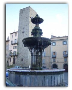 , uno dei migliori esempi di “fontana a fuso” viterbese, ascrivibile al XIII secolo. La struttura è caratterizzata da un bacino circolare e da un pilastrino centrale su cui poggiano un elemento tronco-conico ed una cuspide piramidale impreziosita da foglie d’acanto; l’acroterio, poggiata su un anello merlato, è una pigna decorata da palmette. L’acqua sgorga da quattro cannelle inserite nelle fauci di altrettante teste di leone.