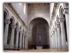 (XII secolo) caratterizzato da un rapporto armonioso tra i severi fusti monolitici a base attica e i raffinati capitelli, nei quali convogliano elementi d’ispirazione classica e motivi propri dell’arte figurativa romanica, come mostri antropomorfi, animali avvinghiati ed esseri fantastici che richiamano alla memoria le sfingi etrusche. Il pavimento