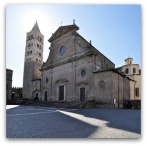 La piazza è dominata dal prospetto della Cattedrale di S. Lorenzo e dal suo campanile (26). Una tradizione risalente al tardo medioevo vuole che l’edificio sorgesse sui resti di un tempio pagano dedicato alla divinità etrusco romana di Hercle/Hercules, tanto che nelle cronache quattrocentesche l’area viene nominata «Castello d’Ercole». La prima citazione certa della chiesa risale all’anno 805. Con l’elevazione a sede episcopale per volontà di papa Celestino III (1192), l’antico impianto pievano venne rimpiazzato da una nuova chiesa il cui modello architettonico si rifaceva alla basilica romana architravata con colonne, transetto e copertura a capriate. Dopo alcuni interventi conservativi nei secoli XIV e XV, nella seconda metà del ‘500 iniziò una radicale campagna di trasformazione per volere del cardinale Francesco de Gambara, che culminò con la demolizione dell’abside centrale ed il rifacimento, in stile rinascimentale, della facciata. Lo smantellamento della struttura medievale continuò col vescovo Brancacci che fece coprire il soffitto con delle volte a crociera. S. Lorenzo fu duramente colpita dai bombardamenti del 1944 e i successivi restauri cercarono di recuperare le antiche forme romaniche attraverso il ripristino del soffitto originario, la ricostruzione dell’abside maggiore e la chiusura delle cappelle laterali cinquecentesche.