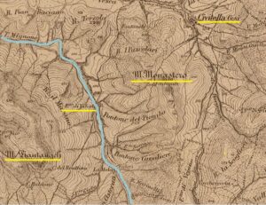 Sulla sponda opposta del Mignone, proprio di rimpetto a Montemonastero, s’innalza Monte Piantangeli (511 m. slm) dove sorgeva un altro convento benedettino, quello dedicato a S. Arcangelo, la cui prima menzione risale all’anno 976.[42] A poca distanza dall’abbazia si sviluppò un piccolo centro abitato, in seguito fortificato e difeso da un castello, lo stesso che più tardi troviamo custodito da una guarnigione al servizio del conte Farolfo.[43]