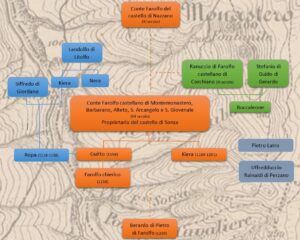 La documentazione del XII secolo induce a ritenere che i Farolfi si fossero imparentati con i Landolfi[44] e che con essi detenessero la proprietà del castello di Sonza; di certo il figlio di Farolfo, Guitto, sposò Roba, nipote di Landolfo di Litolfo, ricco proprietario di immobili e terreni, la cui discendenza si estinse nella linea femminile.[45]