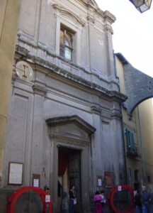 All’inizio di via S. Pietro, subito dopo l’incrocio con via La Fontaine e via S. Leonardo, si staglia il severo prospetto settecentesco della chiesa di S. Orsola. Chiuso al culto da circa un secolo, l’edificio è stato nel tempo adibito agli usi più disparati: autorimessa, magazzino e persino falegnameria. Oggi i turisti (e anche i viterbesi) percorrono questo tratto di strada indifferenti e per nulla attratti da questa facciata disadorna e scolorita. Nelle rare occasioni in cui l’ex chiesa viene aperta al pubblico per accogliere qualche sporadica esposizione, si scopre allora che dietro le sue anonime porte cinerine si nasconde un’ampia navata che preserva ancora antichi altari e qualche sbiadita traccia di pitture, testimoni di un fastoso passato e di oltre ottocento anni di storia.