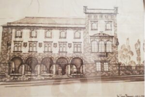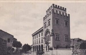 Il palazzo era destinato ad ospitare gli uffici del Consiglio dell’Economia di Viterbo, un ente nato nel 1927 con funzioni di rappresentanza delle categorie economiche locali e alle quali presto si accompagnarono anche compiti di natura amministrativa.[4] Dopo neppure due anni dall’inizio lavori, l’inaugurazione si celebrò nell’ottobre del 1933 alla presenza dell’onorevole Giuseppe Bottai, massimo assertore dell’economia corporativista fascista, del Prefetto Tito Cesare Canovai e del Podestà Filippo Ascenzi nonché dei “fascisti di Viterbo, numerose rappresentanze dei Fasci della Provincia convenute nel capoluogo per la celebrazione dell’XI annuale della Marcia su Roma, le forse giovanili e del lavoro e tutte le organizzazioni del Regime”. Il compimento dell’edificio segnò un importante successivo organizzativo per la non certo dinamicissima classe imprenditoriale dell’epoca; per finanziare l’iniziativa non furono sufficienti le economie accantonate nella breve vita dell’ente corporativo e si contrasse quindi un gravoso mutuo di 900.000 lire con il Monte dei Paschi di Siena. I lavori furono commissionati all’impresa dei F.lli Calabresi che utilizzò 600 m3 di cemento armato, 1.200 ql. di ferro e 600 m3 di peperino. Il ricorso al cemento armato fu necessario, soprattutto, per le enormi piattabande costruite sopra il corso dell’Urcionio, che tutt’oggi scorre sotto il prospetto di via F.lli Rosselli.