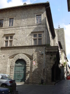 Le finestre a croce del primo livello, anche se prive di cornice marcapiano, si ritrovano sia nel palazzo comunale che in quello Mazzatosta di via dell’Orologio Vecchio; le finestre ad arco del secondo piano, invece, sono inserite in un contorno architravato, quasi una stilizzazione di quelle quattrocentesche di Palazzo Nini in via Mazzini.